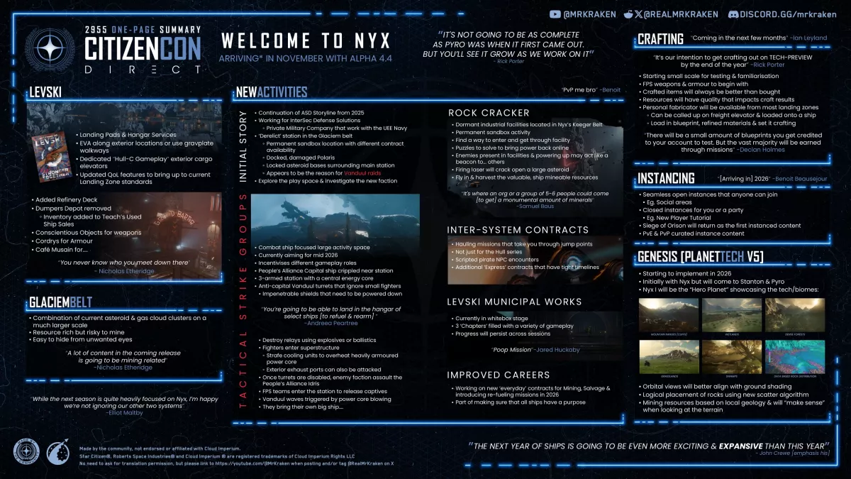 MrKraken reste fidèle à lui-même avec son résumé d'une page des moments forts du CitizenCon Direct 2955, parfait pour se mettre rapidement à jour ou se rafraîchir la mémoire. Découvrez-le sur le Community Hub.