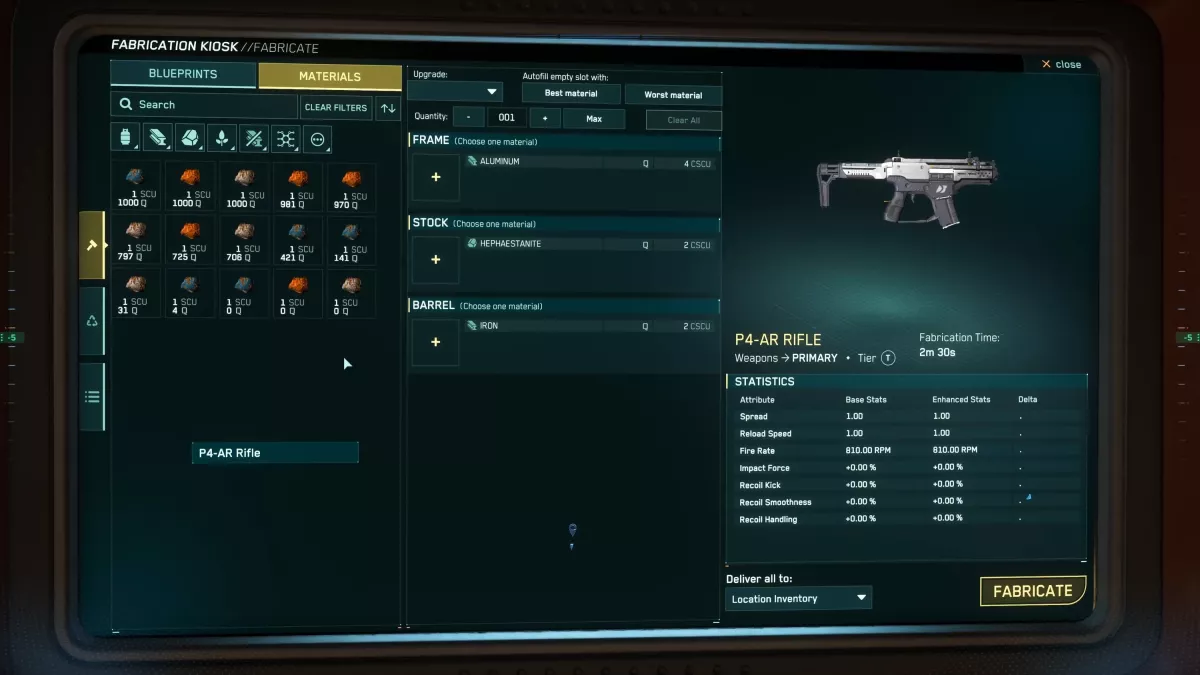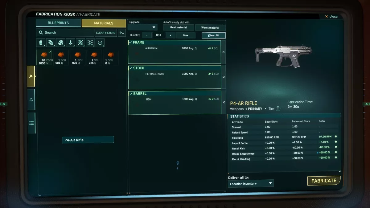Une fois votre choix effectué, vous verrez s'afficher la liste des matériaux requis, mais n'oubliez pas de tenir compte de leur qualité ! En attribuant manuellement des matériaux de votre inventaire local avec des qualités spécifiques, les statistiques de l'objet affiché augmenteront ou diminueront en fonction de vos choix ; vous pouvez également utiliser la fonction de remplissage automatique pour laisser le système choisir à votre place. Le mélange de qualités peut donner lieu à une valeur de qualité moyenne.