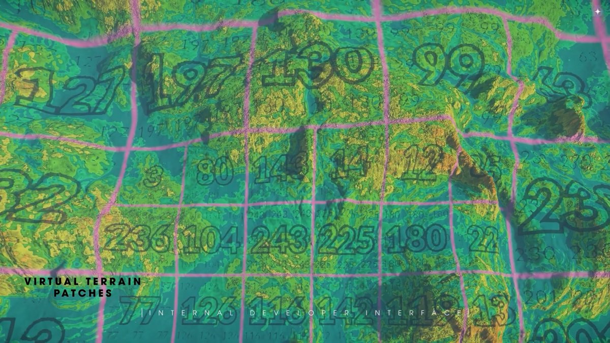 L’algorithme ne se contente pas de créer le terrain, il veille à la cohérence visuelle du global au local : ce qui est visible depuis l’orbite: glaciers, chaînes montagneuses, mers, se trouve reflété fidèlement au niveau du sol, grâce à une technique de "medium tiles" qui équilibre le souci du détail et l’optimisation des ressources, notamment lors des séquences de vol à basse altitude ou des phases de minage.
