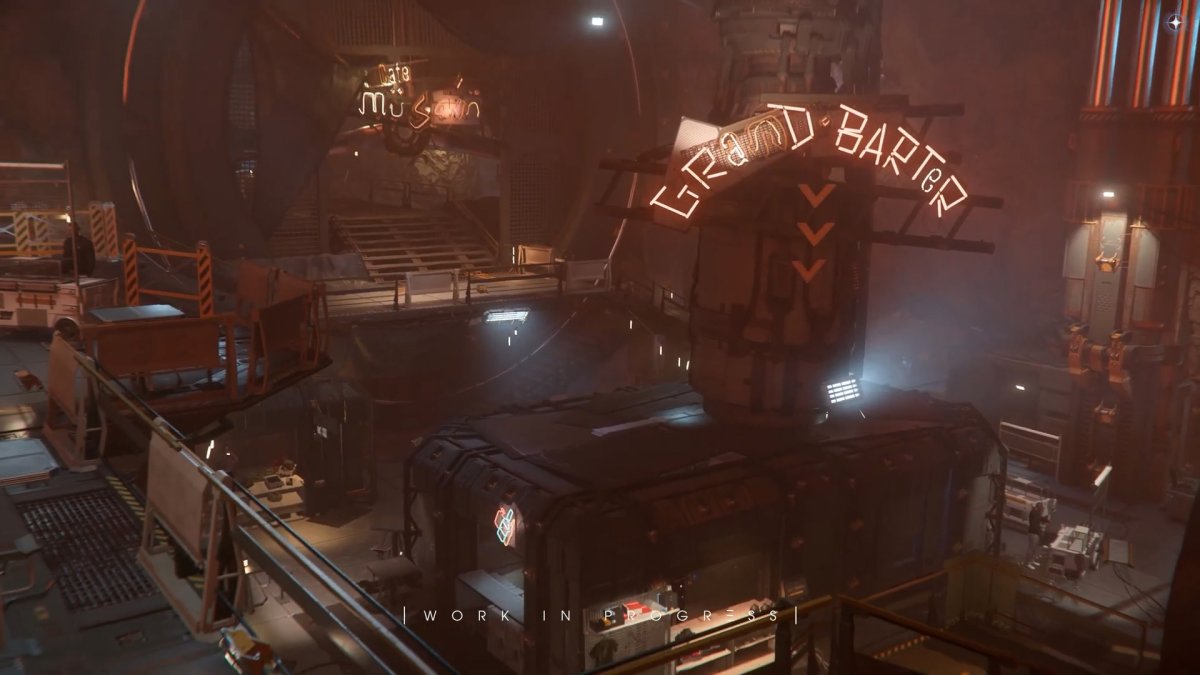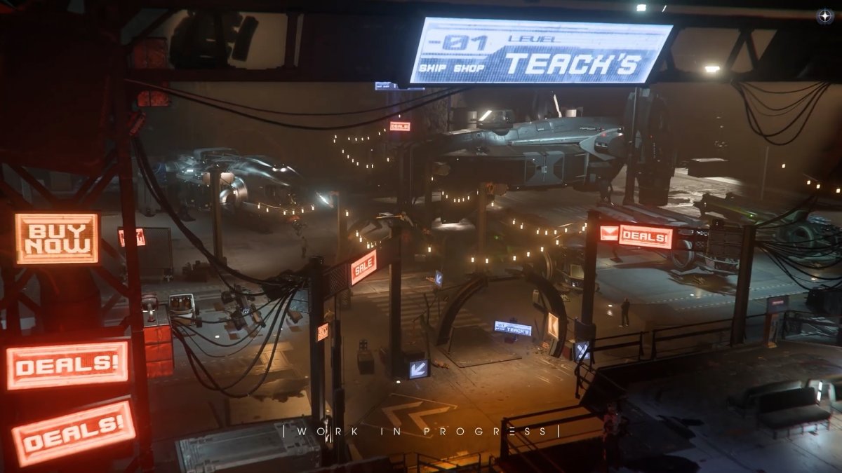 - Poumon commercial et social, ce marché regorge de boutiques et stands improvisés où PNJ et joueurs échangent marchandises légales ou illicites, produits de base et minerais. Les prix fluctuent selon la dynamique du jeu, avec des marchés noirs boostés par la fabrication (butin Vanduul pour améliorations d’armes et d’armures).