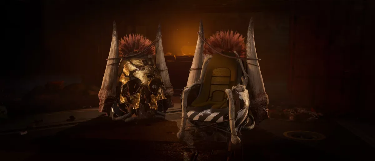 Ce pack contient à la fois la veste Misfit « Bonefire » ornée d’une image stylisée de crânes et de colonnes vertébrales inspirée du gang des Headhunters, et le trône du Seigneur de guerre, fabriqué à partir d’un moteur hors d’usage, d’os d’animaux, de pièces métalliques récupérées et d’une profusion de plumes rouges éclatantes.