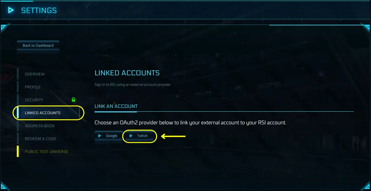 Pour participer, vous devez lier vos comptes Twitch et RSI (voir les instructions ci-dessus).